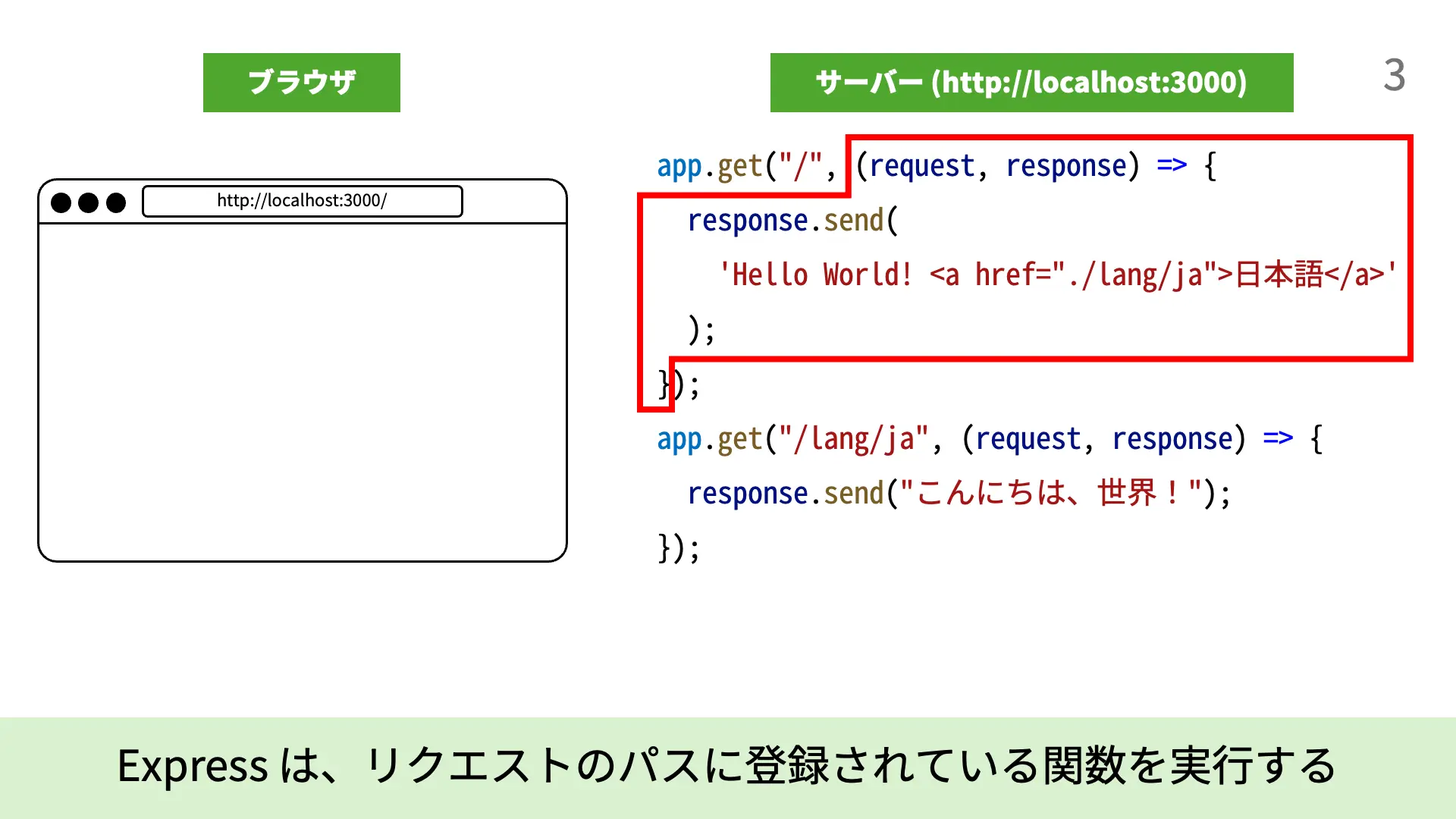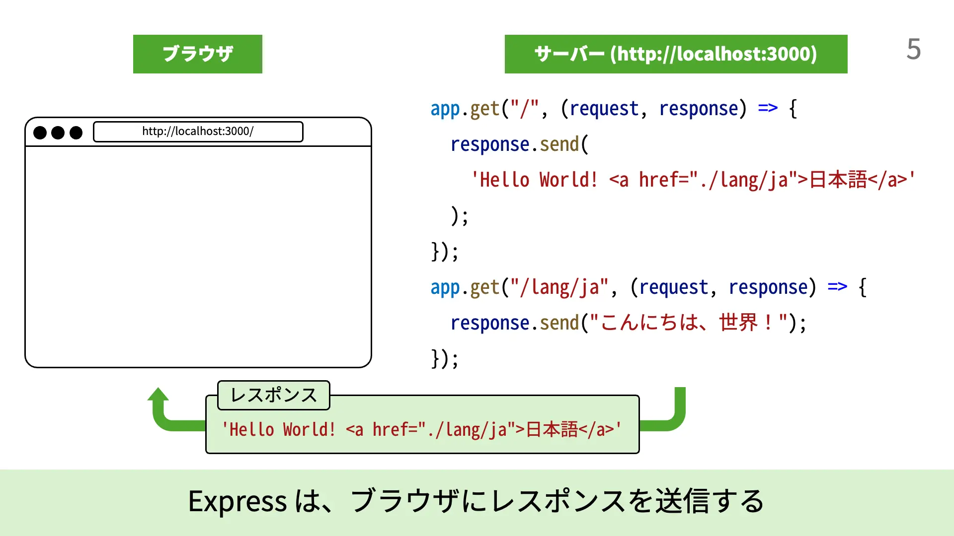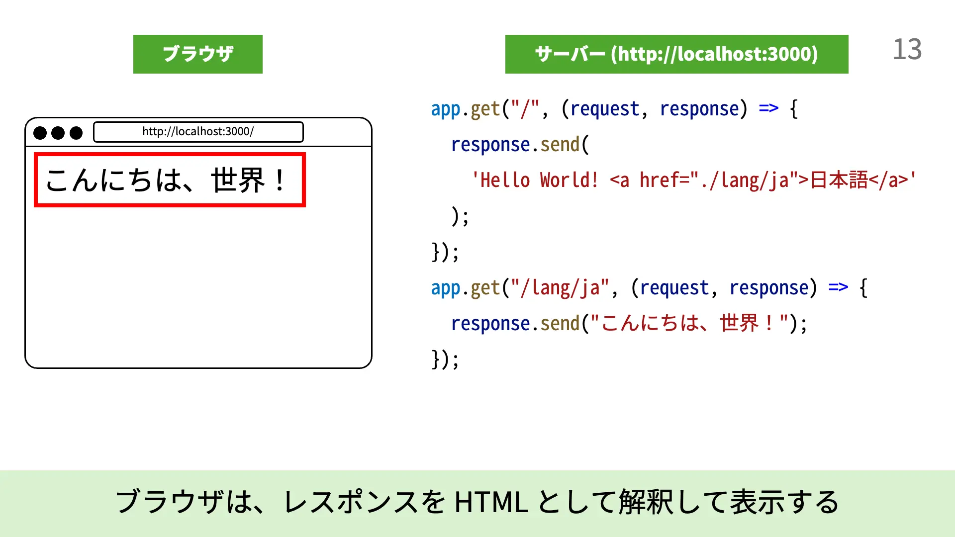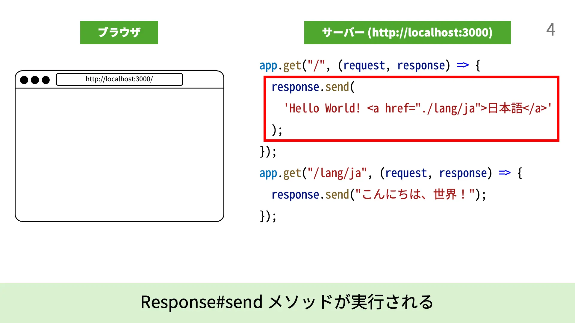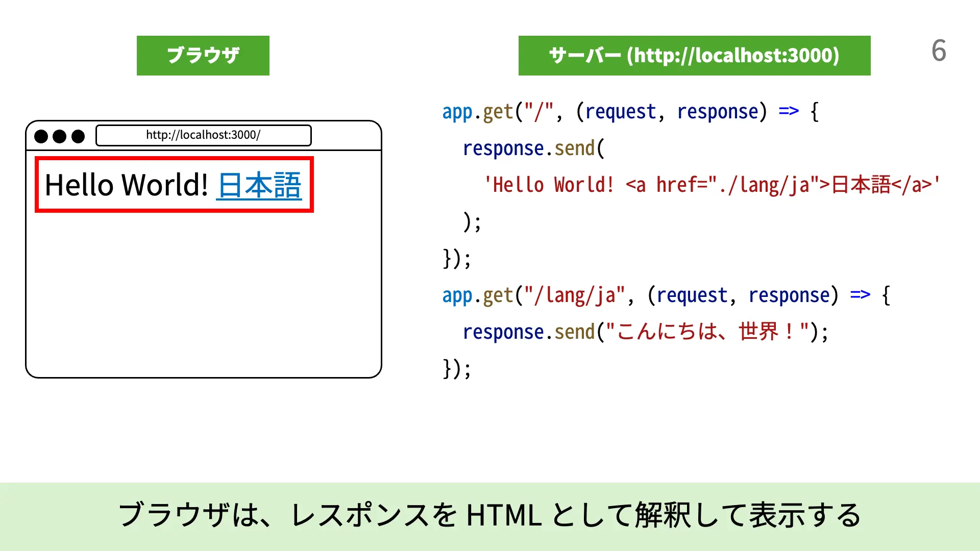 response.send(`...`);により、Expressは`Hello World! <a href="./lang/ja">日本語</a>`という文字列をレスポンスとして送信します。 - ブラウザは、受け取ったレスポンスをHTMLとして解釈し、